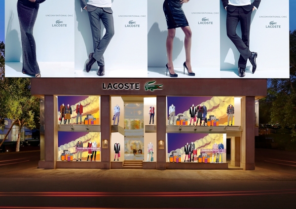 Backdrop visual is an outcome of inspiration from the markets, fairs and cultural variations, the color card was motivated from Diwali celebrations across India. In the South celebrations begin with puja at dawn hence Cosmic Blue hue and Prunier Violet found presence in the suspended artwork placed in the window. As evening approaches celebrations are at their prime in Northern states hence sunset colors Mandarinier Orange and Pitaya (color with shades of pink and brown) had been incorporated in the visual. The light golden circles drew inspiration from the lanterns and lights that adorn the markets of India. A window text “Celebrate the festival of lights with Lacoste” was used to connect with customers. To maximize the impact of the window animation we increased sizes of the backdrop to enhance the overall appeal of the display. Set of cylindrical forms had been used to showcase the merchandise. Mannequin styling played an important role in justifying the festive approach emphasizing a preppy & vibrant expression.